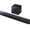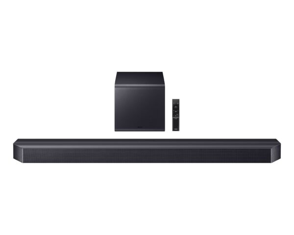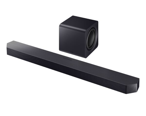 Experience multidimensional sound that transports you out of the living room and into the action, with 7 front channels, 1 subwoofer and 2 up-firing channels. Experience the ultimate 3D sound with Dolby Atmos™ — with or without a cable. Provides a more immersive sound experience when synced with your Samsung TV. With compatible AI TVs, it enhances audio for even more clarity. Automatically calibrates sound and bass for perfection in any room using sensors embedded into the soundbar.